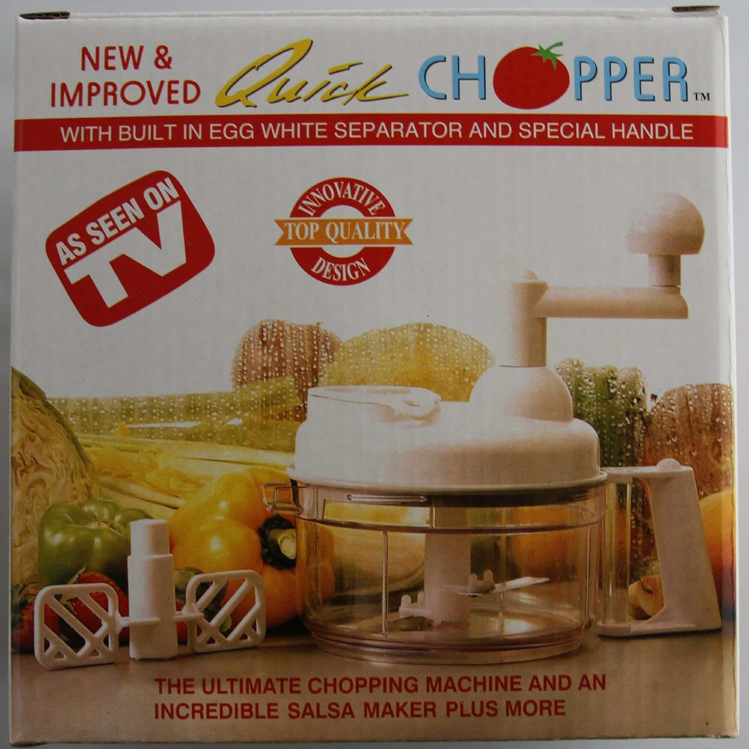 Are you sick and tired of using cheap, crappy plastic grinders? Worried about paying too much for a low quality grinder? Looking for premium quality at the best price? We are long time users just like you, so we understand your concerns. Look no further! We created the perfect grinder you will love and cherish for years to come!Quick Chopper is best for youThe original Quick Chopper with built -in egg white separator and special handle. The ultimate cutting machine and an incredible salsa maker. Quick Chopper comes with 16 pages English & Spanish recipe book. A slight turn of the handle will cut, chop, mix and even beat all vegetables and fruits as you want. Easy to use and clean in seconds. Rotary chopper to prepare salsa, ingredient for hamburger, frizzled rice, fruit juices and to hash garlic, green onion. Rotary beater to beat egg and mix bean powder and to prepare mayonnaise, sauce and baby food. We have been selling the quick chopper for more than 20 years and customers are very happy with it. They come back to buy more of it for others. Low price! Immediate shipping!
