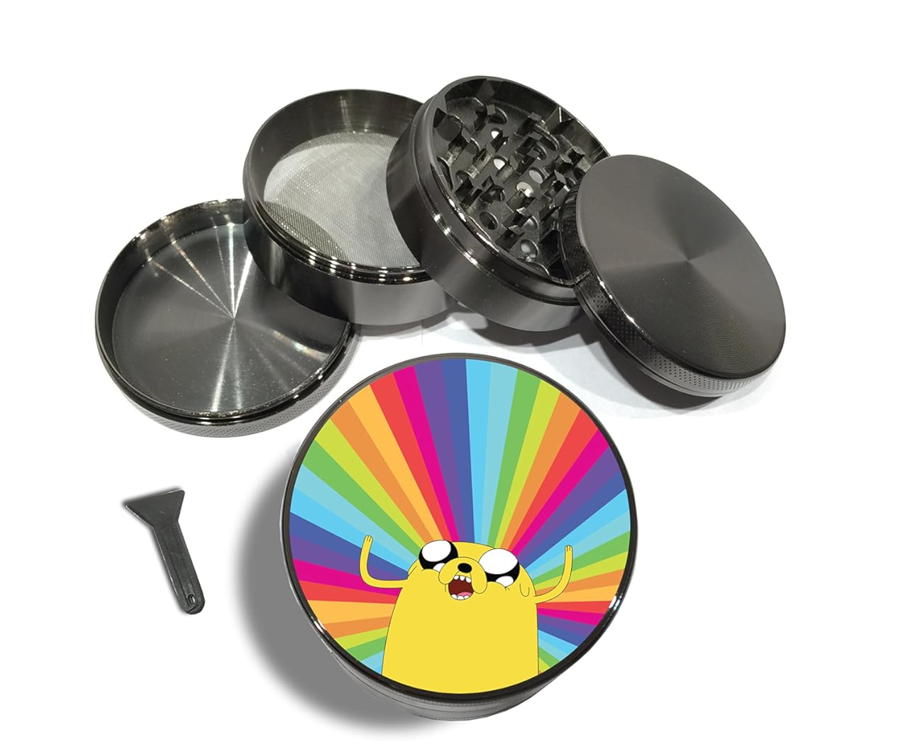 Are you sick and tired of using cheap, crappy plastic grinders? Worried about paying too much for a low quality grinder? Looking for premium quality at the best price? We are long time users just like you, so we understand your concerns. Look no further! We created the perfect grinder you will love and cherish for years to come!Adventure Time Rainbow 4 Piece Premium Zinc Titanium Metal Herb Grinder 2.5" Diamond Grind Gun Metal Finish Premium is best for youPREMIUM ZINC GRINDER • Fifty DIAMOND CUT Grinding Teeth in the main chamber. • Stainless Steel Pollen sifting Screen. • Precision Milled Holes that ensure only consistent sized grains collect in the center chamber. • Powerful Neodymium Magnets to create a tight seal, locking in contents and smells. • CNC machined from a single piece of 100% Pure steel and zinc anodized for increased strength, durability and gun metal shine! • Finger Grips for a slip free grind! • Comes with a pollen scraper! Size: Diameter 2.5” x 1.75” (63mm) Weighs 8 Ounces. DESIGN QUALITY: The high quality custom design is digitally printed and then applied with a clear UV polyurethane coating. This process gives the 2d digital image a 3D effect which also adds a pleasurable tactile feel that is self-healing. Minor cuts and scratches heal themselves so the label will continue looking as new and fresh as the day you received it in the mail! 100% Authentic Grinder!We guarantee that this will be the highest quality and best looking grinder you own or your money back. Guaranteed! All designs are created by Swagstr and packaged with the Swagstr Chevron Gift Box. All items are shipped discreetly. Please check out my other listings for additional designs and types of grinders! Don't settle for anything less. Click the 'Add To Cart' button now to order your Premium Zinc Grinder today and then grind YOUR favorite herb and enjoy.