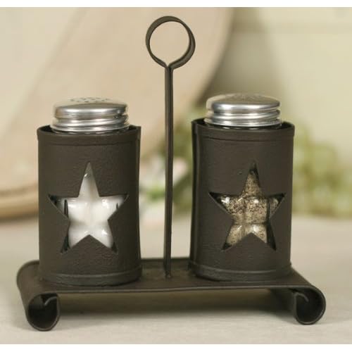 Are you sick and tired of using cheap, crappy plastic grinders? Worried about paying too much for a low quality grinder? Looking for premium quality at the best price? We are long time users just like you, so we understand your concerns. Look no further! We created the perfect grinder you will love and cherish for years to come!Pennsylvania Star Salt and Pepper Shakers with Caddy is best for youUnique country star salt and pepper caddy in punched tin with clear crystal jar shakers. Caddy is 5 1/2' wide and 5 1/4' tall in rustic brown tin. Punched tin star salt and pepper caddy features cut-out stars on both sides. An adorable and functional addition to any country table or retro kitchen counter.