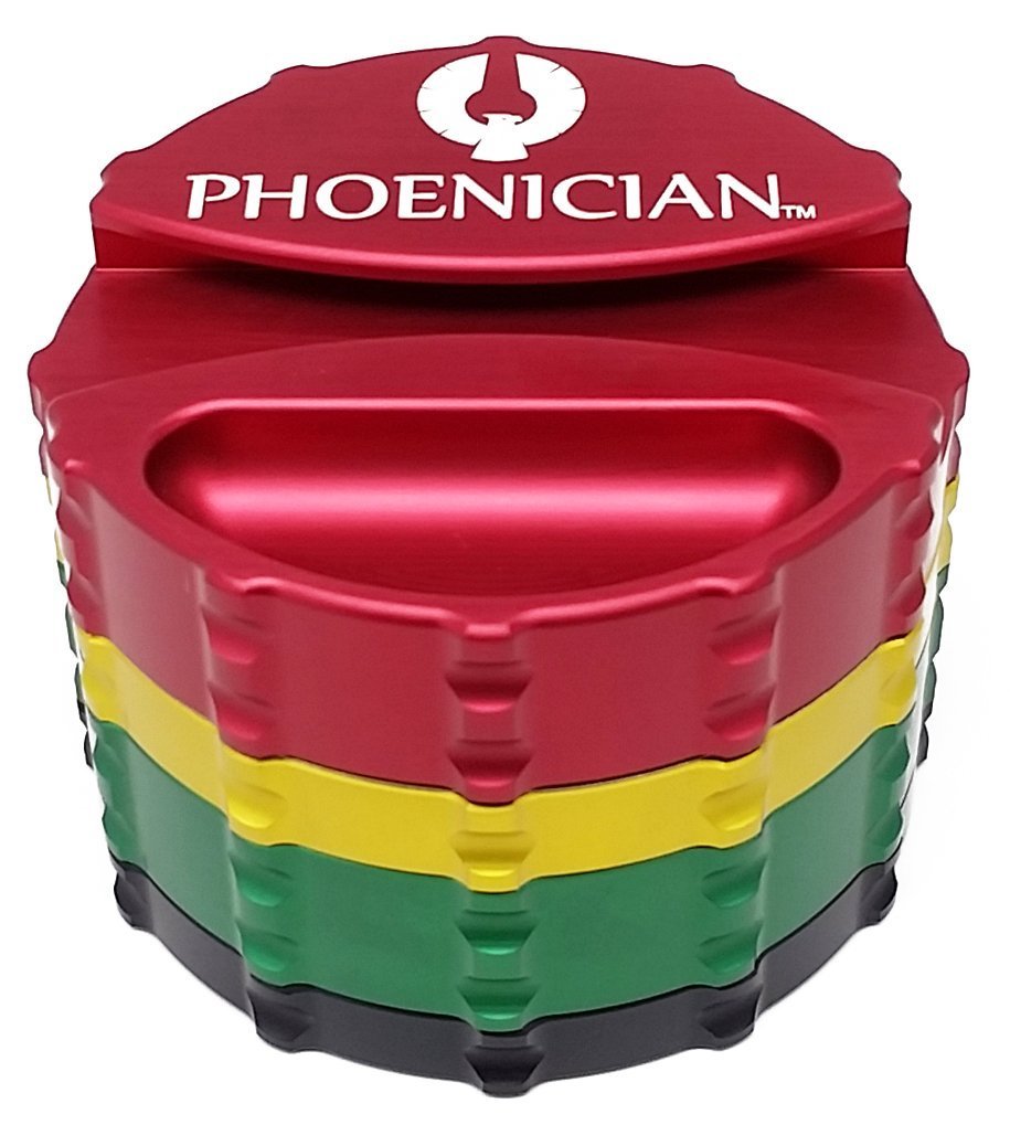 Are you sick and tired of using cheap, crappy plastic grinders? Worried about paying too much for a low quality grinder? Looking for premium quality at the best price? We are long time users just like you, so we understand your concerns. Look no further! We created the perfect grinder you will love and cherish for years to come!Phoenician Large 4pc Grinder With Papers Holder - Rasta is best for youPhoenician Engineering Grinders are innovative in every aspect; they are re-engineered from a patient perspective not a product feature approach. From first glance our grinders are clearly designed with the user in mind, specifically medicinal patients who may have weakened conditions and need a user friendly methodology to prepare medication. While most grinders incorporate a knurl-style grip, the design ultimately provides limited grip. Consequently we've taken every section of our grinder and replicated our new lobe-grip design to provide both superior grip during use but also increased comfort on the hands and structural support. This grip design gives our grinders a unique aesthetic look that incorporates clean radii and dramatic lines that culminate in the best balance of form and function.
