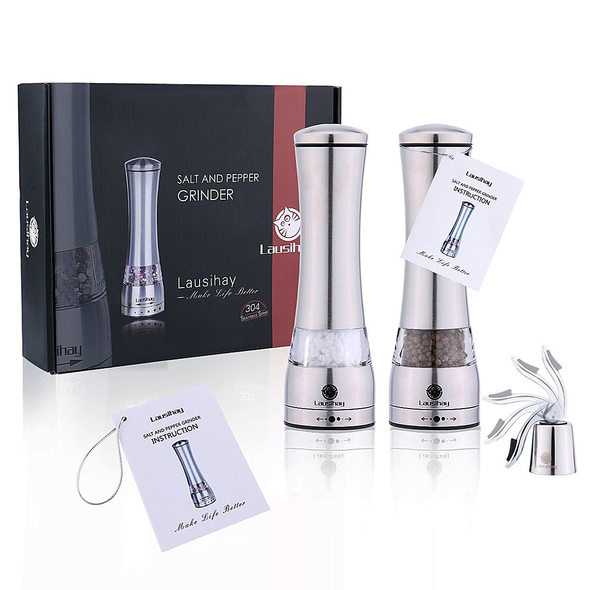 Lausihay 304 Stainless Steel Salt and Pepper Grinder Set (Set of 2) is best for youGreat Quality and DurabilityThe grinding mechanism is made of premium grade ceramic which will give you many years of trouble free service.The glass we used is called acrylic glass; a transparent thermoplastic used as alternative to common glass because of its lightweight and shatter-resistant properties. We carefully selected the type of glass to keep you and your family safe when handling the mills. The stainless steel is a 304, and not necessarily the same steel used on a kitchen knife. Kitchen knives can be made of a range of materials, some of which have a higher carbon rating and therefore rust more easily, and don’t stand up very well to acidic compounds. We chose our type of steel for its aesthetic properties, as well as its longevity in your home.FEATURES AND BENEFITS: Modern and Attractive designThe Lausihay grinder is a great looking mill set. The stainless steel and glass give it a very contemporary and modern look matching with the silver and crystal on your dinner table. Its ergonomic design ensures that your spice gets ground to perfection with the least effort on your part.Fantastic Wine stopper.We promise, you will love this gift!Gift Designed!LIFETIME GUARANTEE!We're so sure you'll love the Lausihay spice mill that we offer a 100% Money Back Guarantee. If for ANY REASON you don't like this product, we'll refund every penny with no hassle.We love our customers and love to talk to you. If you have questions or issues, get in touch and we will reply within 24 hrs. We also have a 100% money back guarantee, we strive to make our customer service the best.Don't Miss This Chance - Scroll Up & Click Add To Cart Now!