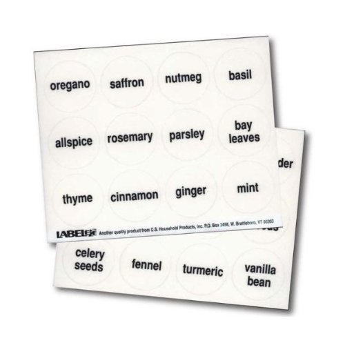 Round Spice Labels, Black Type on Clear, Set of 48 is best for you48 Spice Names, 1.5' Round Transparent Base with Black Print Dishwasher Safe, Self Adhesive - Removable Made in USA Package includes: Allspice Basil Bay leaves Black Pepper Caraway Seeds Cardamom Cayenne Celery Seed Chilies Chives Cinnamon Cinnamon Sticks Cloves, ground Cloves, whole Coriander Cumin Curry Dill Seed Dill Weed Dry Mustard Fennel Five Spice Powder Garlic Powder Ginger Grill Seasoning Herbes de provence Lemon Peel Mace Marjoram Mint Nutmeg Oregano Paprika Parsley Peppercorns Pickling Spice Poppy Seeds Poultry Seasoning Rosemary Saffron Sage Sesame Seeds Star Anise Tarragon Thyme Turmeric Vanilla Bean White Pepper