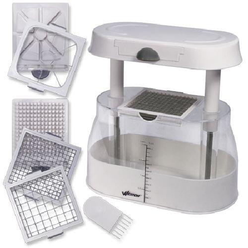 Weston Multi-Chopper is best for youThe Weston Mini Chopper will core, wedge, slice and dice fruits and vegetables quickly and easily. It has three interchangeable stainless steel blades, 1/2-inch Blade, 1/4-inch Blade, and a Corer/Wedger blade. There is a large easy-view container and a slip resistant bottom. Also has quick and easy clean up.