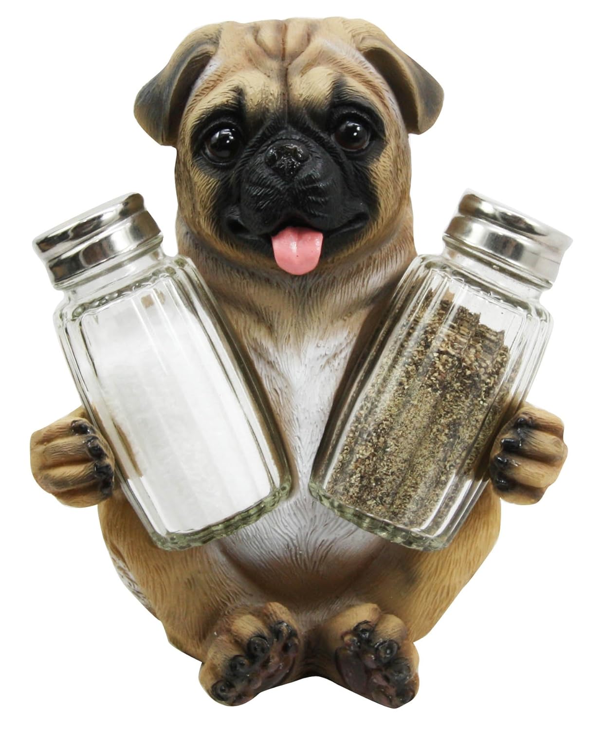 Adorable Hugging Pug Dog Decorative Glass Salt Pepper Shakers Holder Resin Figurine is best for youThis cute pug dog figurine resembles our very own pet! He has a wrinkly face, curled tail and extra flesh in the right places, making him such a lovely dog! He is hugging two glass salt pepper shakers and he looks at you with his warm eyes everytime you cook or eat!