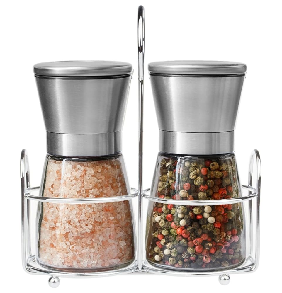 - MODERN and UNIQUE: Stainless Steel and Glass Salt and Pepper Grinder Set - Simple design with no logos or branding that will look elegant and smart on your table at all times and charm your family and guests.