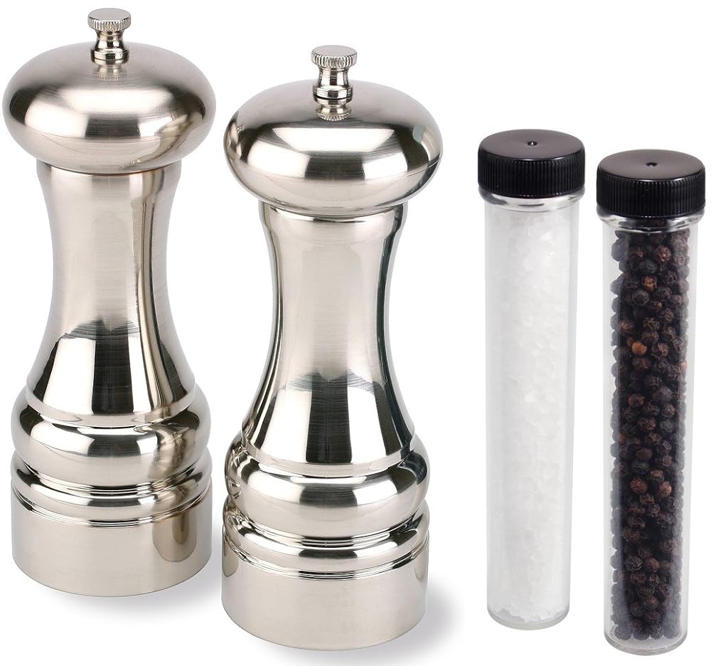 Olde Thompson 7" Brushed Nickel Plated Pepper and Salt Mill Gift Set with Refills best Seasoning & Spice Tools