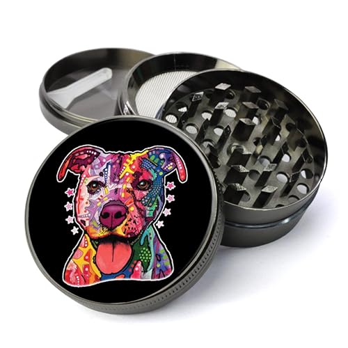 Pitbull Rainbow Psychedelic Dog Extra Large 5 Piece Spice Tobacco Herb Grinder with Pollen/Keef Catcher is best for youColor:Pitbull GRINDING THE FRESHEST HERBS FOR YOUR PIPE (OR YOUR DINNER!) HAS NEVER BEEN EASIER! Grind fresher, faster and easier now, with our 5-piece coarse herb grinder! - Are you tired of fresh, moist herbs getting jammed up? - Does your material get stuck between the teeth or along the sides? - Is the chamber for your ground up material too small? 5 Reasons this is the grinder for you! - Our Grinders feature sharp precision CNC aluminum teeth to shred herbs with ease, even when fresh/moist - Ridges built into the lid push material back into the teeth for a perfect grind every time. - Large pollen screen allows for the herbs to stay on top while the crystals fall down. - Perfectly shaped holes allow more material to drop in easier. - Use the grinder for storage - Powerful neodymium magnet keep the heavy duty lid on tight to keep your ground herbs fresh longer. BONUS: Remove the screen section, and this grinder becomes short enough for travel, and creates a large super-chamberExpression Essentials: bringing Amazon a brand you can trust for quality premium grinders. Package contents: 1 X-Large 2.5 Inch premium grinder (4 part grinder) 1 Mini spatula for collecting pollen/keef Individually boxed, and shipped discreetly