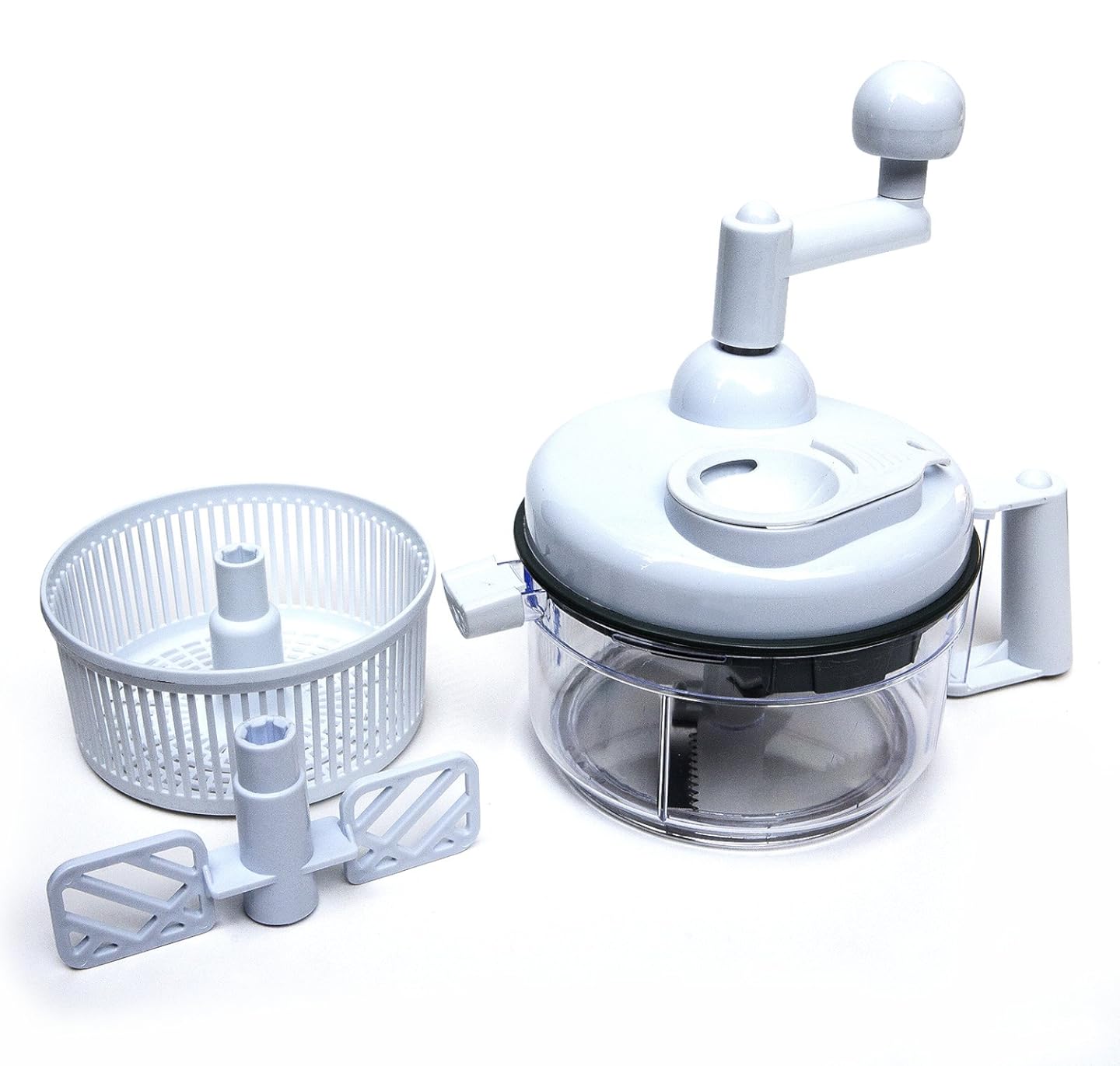 Salsa Maker, Food Chopper, Mixer and Blender - Miracle Chopper Manual Food Processor is best for youSalsa Maker, Food Chopper, Mixer and Blender - Miracle Chopper Food Processor - Add incredible chopping power to your kitchen with this amazing tool. The Salsa Express Miracle Chopper can make salsa, chop onions, prepare salads, dice tomatoes, separate eggs and so much more. It is a manual food processor, so it doesn't need electricity, but it will offer similar speed and results when compared to those expensive alternatives. With just a slight turn of the handle, you will be able to chop, mix or beat faster than ever, and the effortless operation will result in food that is cut 20 times faster than you could with a knife. A two part blade spins around with each rotation, so for every turn, you will be chopping several times, and in multiple locations. Each blade is also double sided, so you can cut in both directions for maximum power. Either way you turn it will result in chopping, so give it a couple twists one way, and then spin it back in the other direction for a quick and even cut. It can help you make homemade salsa for your next party, chop onions without crying, or even meatloaf for dinner.
