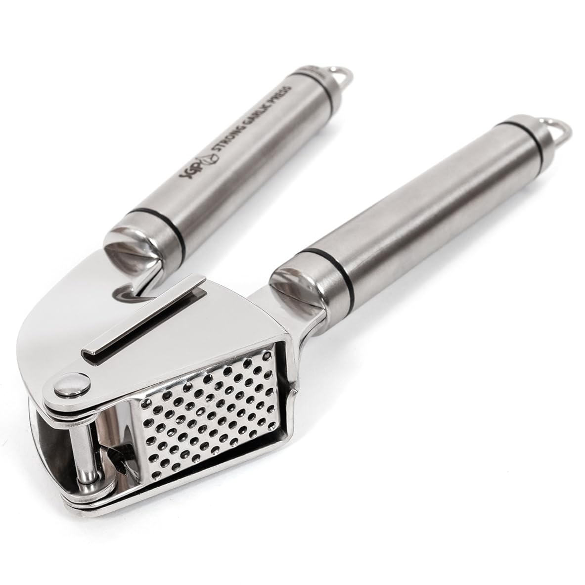 Strong Garlic Press Stainless Steel Mince Peel Crush Chop Garlic With Cleaning Brush and New Recipe eBook is best for youEnhance Your Cooking Experience with the Stainless Steel Mincer Name Strong Garlic Press! Throw away your old press. Enjoy the new garlic press, ergonomic garlic press in retro packaging. Why to choose our Professional Garlic Press? - PREMIUM QUALITY - Made with 100% stainless steel garlic press, this press won’t peel, rust, or fall apart. - SMART & STYLISH DESIGN - Designed with crisp seams to prevent garlic from coming through or getting trapped. Virtually anyone can use this press, making it a great gift! - EASY TO USE - Accentuated by a thick and user-friendly handle, this press offers a comfortable grip that makes it easy to use. Dishwasher safe. - EFFICIENT - Gently squeeze the handles together to effortlessly mince or crush garlic. - LIFETIME SATISFACTION GUARANTEE - Worry-free protection for the life of your professional garlic press. Simply let us know, and we will work to solve your problems. Items included in the package - Garlic press from Stainless steel 304 - Garlic peeler (black) - Brush (black) Limited 200 pieces available with lifetime membership in our online club! Join today our dozens of satisfied customers; Your Satisfaction is Money Back Guaranteed; No Questions Asked! For This TIME - Is A Limited Time Price - Don’t Be The One To Miss It. Order Yours Now!