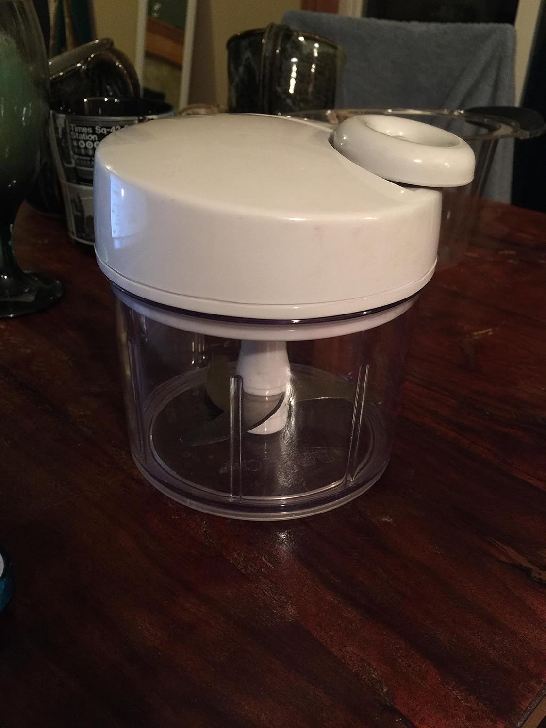 The Pampered Chef All New Manual Food Processor Chopper is best for youDrop in ingredients and pump the handle — the more you pump, the finer the cuts. Combine ingredients for quick salsas, dips, egg salad and tapenades. Includes handle lock for storage, measure marks, nonskid base and storage lid. 3 cups.