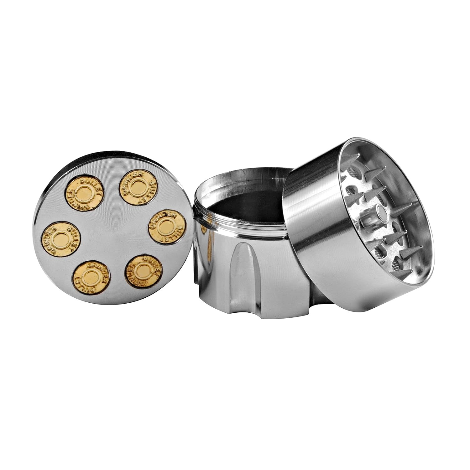 Goliath Industry 2" Aluminum 3 Piece Tobacco Spice Herb Revolver Bullet Grinder - Fun Novelty Mill Tool is best for youYou are buying a mini size Revolver Pistol Gun Bullet Cylinder Style Herb Spice Grinder with Pollen Catcher • This novelty case is cleverly disguised as the loaded chamber of a revolver • Comes in silver tone finished body & gold tone polished ornate bullet parts. • Look great that set this on apart from the crowd • Made of Strong metal & Great texture with fine chrome polished surface • The grinder includes 3 pieces • Double sided magnetic grinding compartment has a mesh screen bottom that automatically collects pollen • The bottom compartment can be used to store your grounded herb or simply to hold & collect your pollen • High quality 24 mean sharp pyramid teeth • Crush your spice herb into the perfect fluffy texture in seconds • Making tedious hand breaking a thing of the past