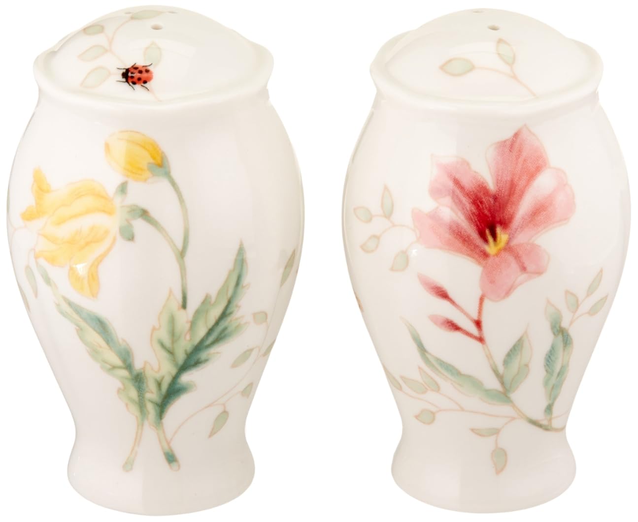 Lenox Butterfly Meadow Salt and Pepper Shaker Set is best for youStyle Name:S&P Shakers Product Description The most popular casual dinnerware collection in America, Butterfly Meadow is truly a contemporary mix and match classic. Inspired by the artistry of Louise Le Luyer, there are many delightful pattern varriations to choose from, each offering an exquisite array of butterflies, blooms and other wonders of nature, all rendered in a soft color palette. Crafted of the finest Lenox porcelain, Butterfly Meadow is the perfect choice for today. All of the dinnerware is safe for use in the dishwasher, the microwave and guarantees superior freezer to oven to table performance. Designed for chip-resistant durability, Butterfly Meadow will take a cherished place in your home for many years and offers the opportunity to expand your collection with the incredible range of dining, decor and gift giving choices available. Best of all, this versatile, stylish and fun collection is created by Lenox, America's first name in home entertaining. Known around the world for offering a unique combination of design, artistry and superior quality for over 125 years, Lenox has unmatched durability and is backed up by a lifetime replacement program to guarantee many years of enjoyment. Add style to your seasoning with this coordinating pair of Butterfly Meadow salt and pepper shakers. This giftboxed set helps bring your table together in every detail. Amazon.com Charmingly curvy, these fine porcelain salt and pepper shakers from the Lenox Butterfly Meadow pattern add an attractive botanical touch to any table. Though unquestionably a matched set, the shakers feature distinct flower and vine patterns created by Lenox artist Louise Le Luyer. The two-holed shaker is painted primarily in pink blossoms, while the three-holed shaker is done mostly in yellows. The shakers' rounded design is easy to control, while the tapered foot and scalloped collar add loft and grace to their profiles. The pieces are dishwasher-safe and are covered by Lenox's lifetime replacement policy. Each shaker measures 2-1/4 inches in diameter and stands 4 inches tall. --Emily Bedard
