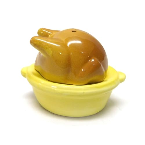 Turkey and Roaster Novelty Salt and Pepper Shakers is best for youKeep roasted turkey on your table or kitchen counter all year long with a ceramic salt and pepper shaker set. The turkey will sit in the yellow roasting pan until you lift it away and shake the seasonings onto your favorite foods. Makes a charming gift and a great addition to any salt and pepper shaker collection. Hand wash only. Imported. 3'H x 2.75'W x 2.5'D