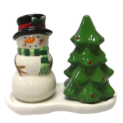 Ceramic Snowman with Christmas Tree and Tray Salt and Pepper Shakers is best for youThis salt & pepper shaker set makes a great addition to any kitchen or dining room table. Comes with one salt shaker and one pepper shaker.