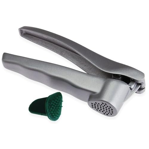 Prepworks from Progressive International GIGP-93 Aluminum Garlic Press with Non-Stick Coating is best for youProgressive International is your source for the widest range of functional, inventive, and fun kitchen tools and great ideas put into practice. Our in-house designers spend hours in the kitchen coming up with ways to improve on a variety of traditional tasks and tools. Established in 1973, our commitment to quality and service allows us to offer a broad selection of quality kitchenware and other household products. There's no need to peel garlic with the Progressive garlic press. Just insert the clove into the well and squeeze the handle. The peel stays in the press while the garlic is extracted from it. Made from aluminum with a non-stick coating, it's always easy to clean. A handy cleaner removes the garlic skin from the holes and stores inside the the handle when not in use.