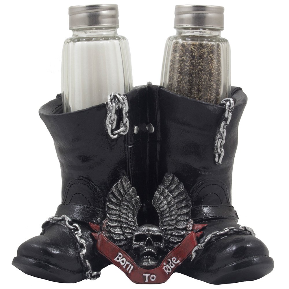 Decorative Black Motorcycle Biker Boots Glass Salt and Pepper Shaker Set Figurine with Born to Ride Banner, Skull & Eagle Wings Symbol for Bar or Kitchen Decor As Gifts for Harley Riders by Home-n-Gifts is best for youSunday Drivers, step aside... this awe-inspiring salt and pepper shaker set creates visions of a wicked chopper out for a wild and wayward ride! Bold and bright, this pair of black faux leather biker boots proudly sports the fabled logo and every biker's motto: 'Born To Ride,' complete with skull and eagle wings symbol. The very essence of the brave and mighty biker spirit is captured here in formidable detail. A fitting tribute to your favorite Harley rider and wild-at-heart road warrior! A must have for any biker bar, and a great Christmas gift for that motorcycle enthusiast on your shopping list. Three piece set includes one decorative salt and pepper display holder and two glass salt & pepper shakers.